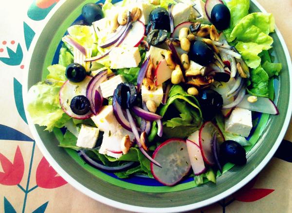 Dla przykładu. Na śniadanie zjem jabłko, potem chleb własnego wypieku z mąki 2000 z dżemem bez cukru i serem białym chudym. Obiad: makaron z sosem pomidorowym i jakimiś warzywami gotowanymi. Kolacja: łosoś wędzony z sałatką z sosem winegret i serem fetą.